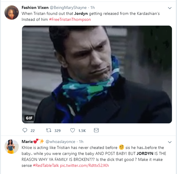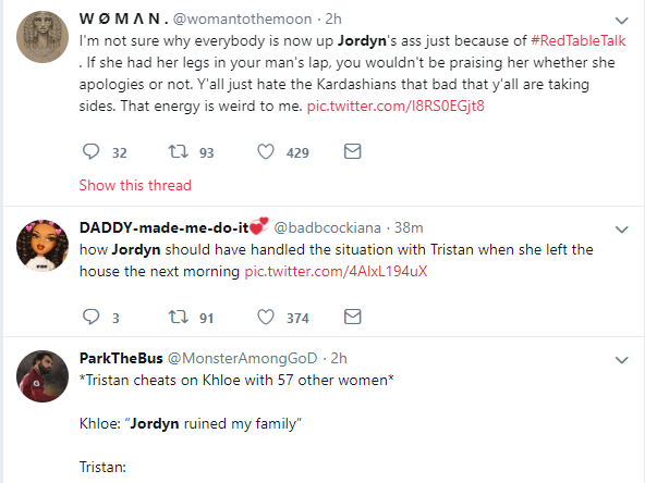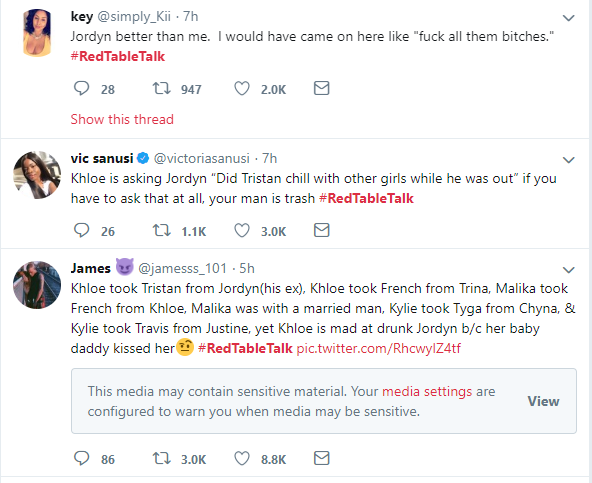 Here are some Twitter reactions to Jordyn Woods' first Interview on Red Table Talk with Jada Pinkett Smith, where she addressed cheating scandal with Tristan Thompson.See the reactions below.Most Popular Tags