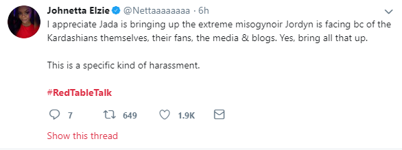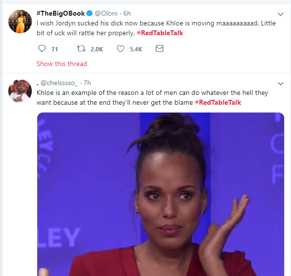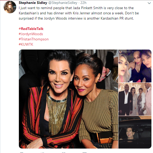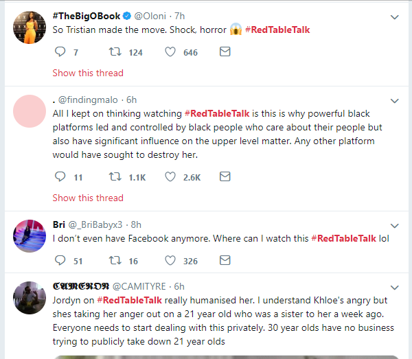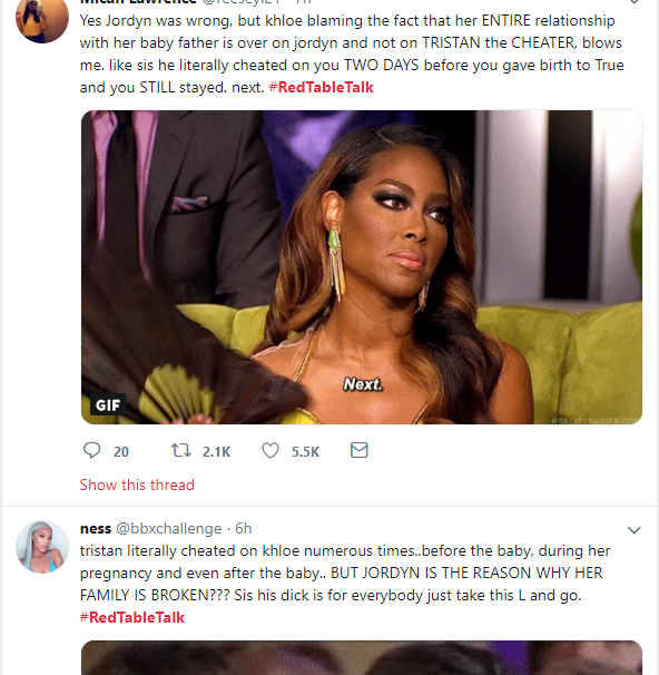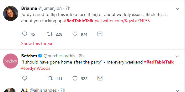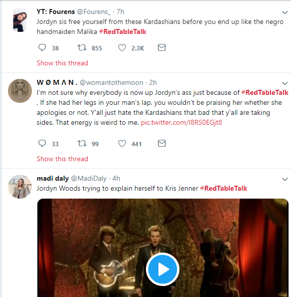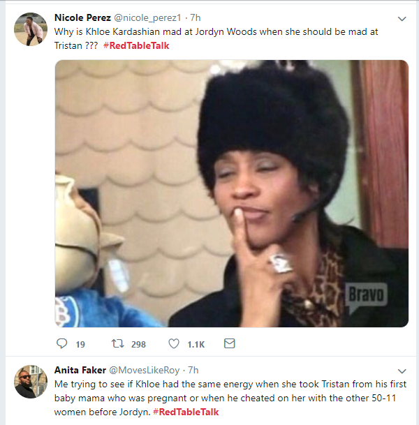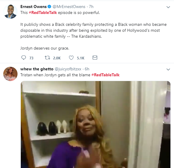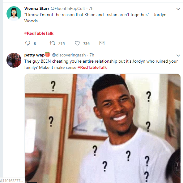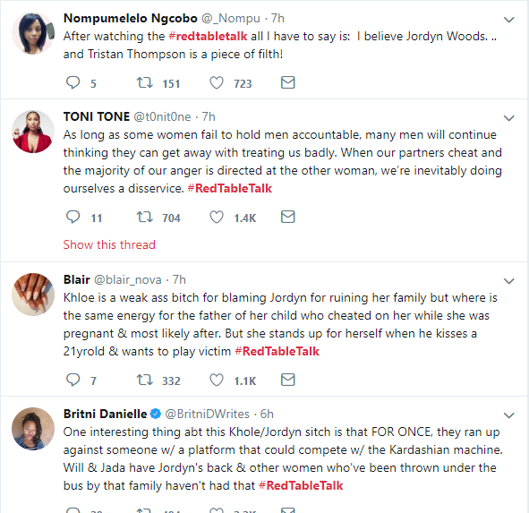 Here are some Twitter reactions to Jordyn Woods' first Interview on Red Table Talk with Jada Pinkett Smith, where she addressed cheating scandal with Tristan Thompson.See the reactions below.Next Article