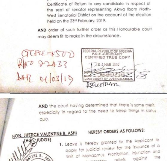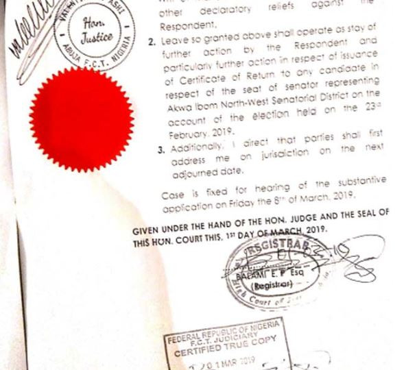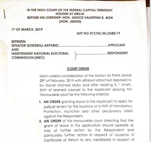 A Federal Capital Territory (FCT) High Court sitting in Apo, Abuja has ordered the Independent National Electoral Commission (INEC) to 'stay action' on the issuance of a certificate of return to any candidate in Akwa Ibom North West senatorial district election. Justice Valentine Ashi made the order on Friday, following an application with suit No ‘FCT/HC/M/2680/19’, with Senator Godswill Akpabio as the applicant. She restrained the respondent in the suit – the Independent National Electoral Commission (INEC) – from issuing any certificate, pending the determination of the suit before the court. In an exparte motion dated February 28, 2019, with an affidavit deposed to by one Daniel Idoko and filed on March 1, Senator Akpabio prayed the court for leave to apply for “judicial review for the issuance of writ of Mandamus, prohibition, injunction, and other declaratory reliefs” against INEC. He also asked the court to direct the respondent to stay further action, ”particularly further action in respect of issuance of certificate of return to any candidate in respect of the seat of senator representing Akwa Ibom North West Senatorial district on the account of election held on the 23rd February 2019.” Granting the order, Justice Ashi said there was “some merit, especially in regards to the need to keep things in status quo.” “Leave is hereby granted to the applicant to apply for judicial review for the issuance of a writ of mandamus prohibition injunction and other declaratory reliefs against the respondent,” she held. The judge further ordered a stay of issuance of a certificate of return to any candidate in respect of the seat as sought by the applicant She adjourned the case till March 8 for hearing and directed the parties to first address the court on jurisdiction on the next adjourned date. See the court papers below...