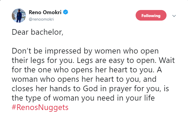 'Dear bachelor, dont be impressed by women who open their legs for you' - Reno Omokri says
