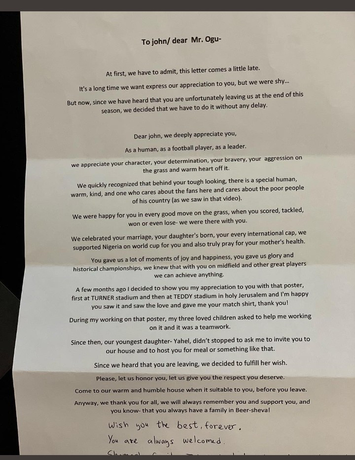 John Ogu has shared a heartwarming letter he received from a "special family" who are fans of his.The footballer, who currently plays for Hapoel Be'er Sheva in Israel but will be leaving by the end of the season, received a letter from the family telling him how much he is appreciated.Read the touching letter in the screenshots below.
