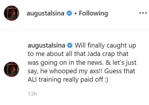 R&B singer August Alsina is down with allergies that left his face swollen but he went on Instagram to joke about his face busting out courtesy of Hollywood actor Will Smith punching him. He wrote, 'Will finally caught up to me about all that Jada crap that was going on in the news. & let’s just say, he whooped my axs!! Guess that ALI training really paid off'.