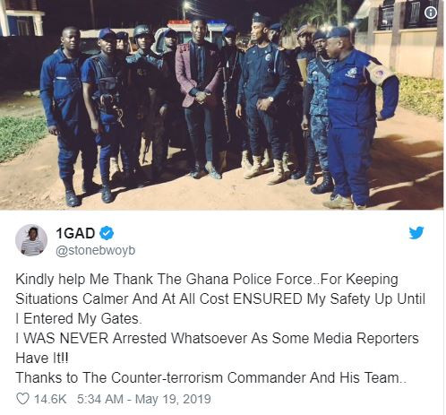 Stonebwoy has denied reports he was arrested by the police after he pulled gun on stage at the just concluded Vodafone Ghana Music Awards. Pulling out the gun disrupted the show for some minutes because there was a little scuffle between Shatta Wale’s crew and that of Stonebwoy and there were reports in sections of the media that Stonebwoy has been arrested. But he tweeted that he was not arrested like some media outlets are reporting, adding that the situation has been calmed by the Counter-Terrorism Commander of the police service. 'Kindly help Me Thank The Ghana Police Force..For Keeping Situations Calmer And At All Cost ENSURED My Safety Up Until I Entered My Gates. I WAS NEVER Arrested Whatsoever As Some Media Reporters Have It! Thanks to The Counter-terrorism Commander And His Team' he tweeted.