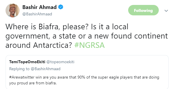 See presidential aide, Bashir Ahmad's reply to twitter user who said most of the Super Eagles players 'are from Biafra'