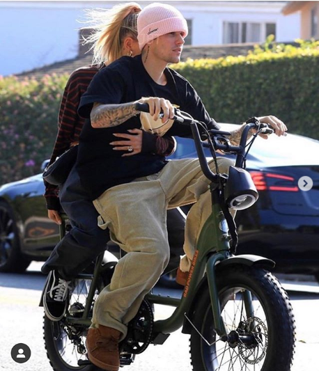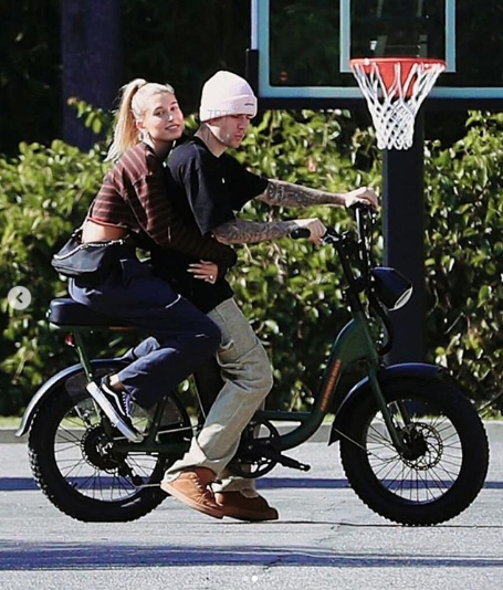 Hailey Bieber clings to Justin Bieber as they ride on his bike (photos)
