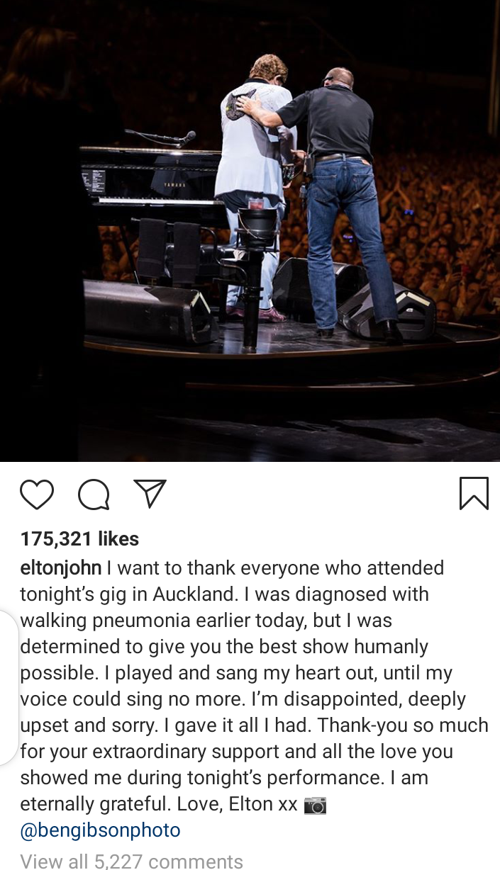 Music legend, Elton John was forced to cut short a concert in New Zealand after announcing that he was diagnosed with walking pneumonia. The singer, who is continuing his multi-year farewell tour, lost his voice mid-way through his set at Auckland’s Mount Smart Stadium on Sunday.“I’ve just completely lost my voice. I can’t sing,” he told the crowd. “I’ve got to go. I’m sorry.” He then appeared to weep as he leaned on his piano and shook his head.After making the announcement he was escorted off stage. 72 year old Elton John also posted about his illness to Twitter and Instagram, telling fans he was "deeply upset and sorry" for his performance while on tour in Auckland, New Zealand, on Sunday while thanking them for their support."I want to thank everyone who attended the #EltonFarewellTour gig in Auckland tonight. I was diagnosed with walking pneumonia earlier today, but I was determined to give you the best show humanly possible."I played and sang my heart out, until my voice could sing no more. I'm disappointed, deeply upset and sorry. I gave it all I had. Thank you so much for your extraordinary support and all the love you showed me during tonight's performance," he said, adding that he was "eternally grateful."