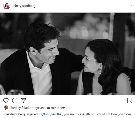 Facebook Chief Operating Officer, Sheryl Sandberg, 50, is engaged to Tom Bernthal, 46, nearly 5 years after she lost her husband. Bernthal popped the question on February 1 as the couple went on a mountain hike to recreate their first date.Sandberg took to Facebook and Instagram hours ago to share the good news. "Engaged!!! @tom_bernthal, you are my everything. I could not love you more," she captioned a black and white photo of her and Bernthal looking into each other's eyes.