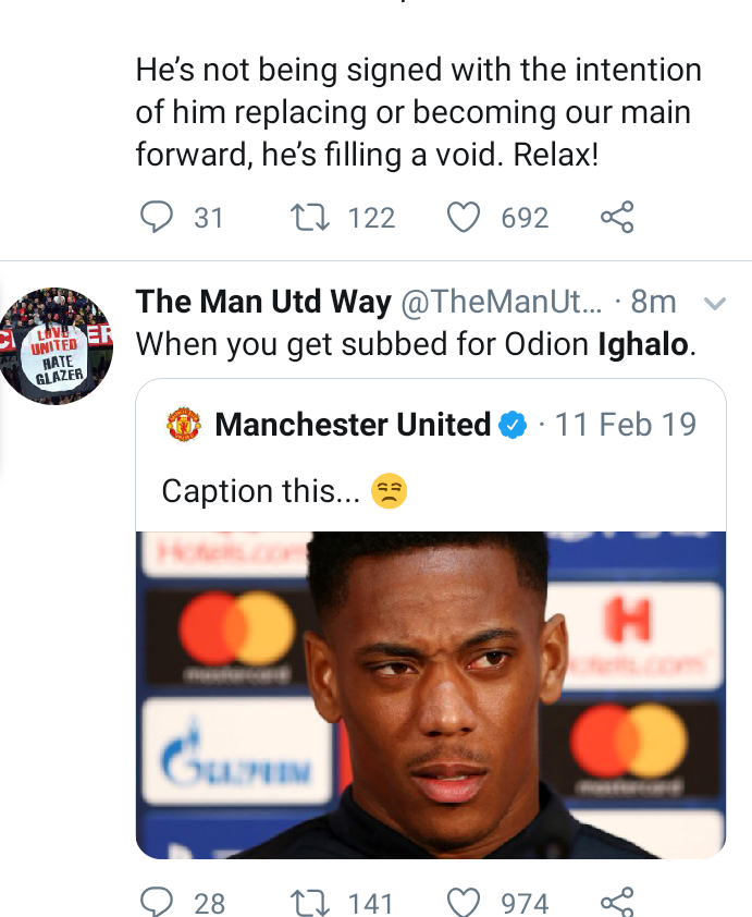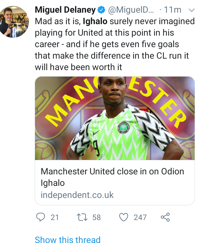 According to Sky Sports, Manchester United have agreed a deal with Shanghai Shenhua of China to sign Nigeria forward Odion Ighalo just hours before transfer deadline approaches.According to multiple reports in England, Ighalo has been signed on a six months loan deal and will fly into Manchester on Saturday morning to finalize his signing with the club. Twitter users however expressed mixed emotions regarding the news. Some feel he truly deserves such a big move in his career and feel Man United run no risk with the deal while some feel Manchester United shouldn't have waited till the last hour to sign a striker when they had a month to make signings. See some reactions below.