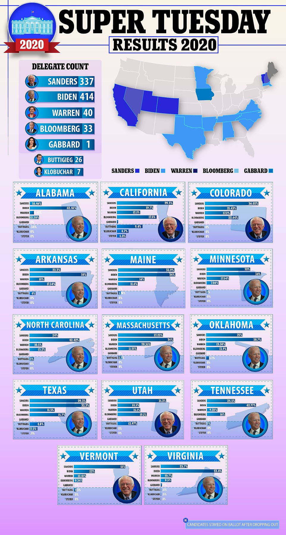 Elizabeth Warren lost in her home state of Massachusetts with Biden winning at least 28 delegates in her state and beating her in her own hometown and was mocked by Donald Trump on Twitter for losing in her own home town saying she should go home and 'drink a beer'.There will be another Super Tuesday on March 10, when Missouri, Michigan, Washington and Mississippi will vote their preferred candidates .The eventual Democratic nominee will slug it out with Trump in November to determine the next US President. The post