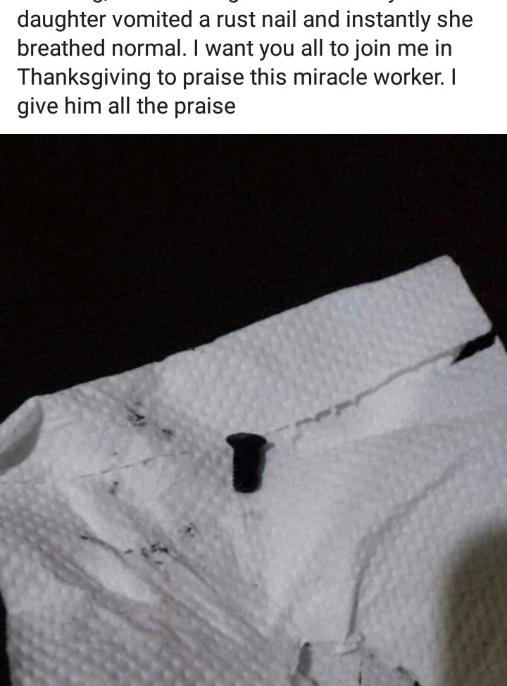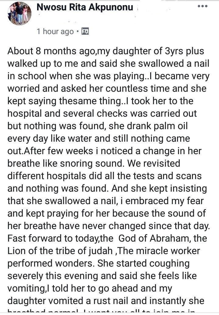 A mother took to a Facebook group to rejoice after her 3-year-old daughter vomited an iron nail she swallowed eight months ago. The mother said her daughter returned from school one day and informed her that she swallowed nail in school. Several medical tests were carried out but the doctors couldn't find anything. Traditional means was also tried, with the mother giving her child red oil to drink to enable her pass the nail out, yet that didn't work. The child's breathing soon became laboured yet hospitals couldn't help. Fortunately, on Monday, April 20, the little girl started coughing and soon vomited the rusted nail. The happy mother shared a photo of the nail and wrote: "About 8 months ago,my daughter of 3yrs plus walked up to me and said she swallowed a nail in school when she was playing..I became very worried and asked her countless time and she kept saying thesame thing. "I took her to the hospital and several checks was carried out but nothing was found, she drank palm oil every day like water and still nothing came out.After few weeks i noticed a change in her breathe like snoring sound. "We revisited different hospitals did all the tests and scans and nothing was found. And she kept insisting that she swallowed a nail, I embraced my fear and kept praying for her because the sound of her breathe have never changed since that day. "Fast forward to today,the God of Abraham, the Lion of the tribe of judah ,The miracle worker performed wonders. She started coughing severely this (Monday) evening and said she feels like vomiting,I told her to go ahead and my daughter vomited a rust nail and instantly she breathed normal. "I want you all to join me in Thanksgiving to praise this miracle worker. I give him all the praise."