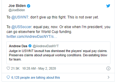 'Equal pay for male and female players, or no World Cup funding when I become president'' -Joe Biden gives US Soccer ultimatum after judge throws out players request for equal pay appeared first on